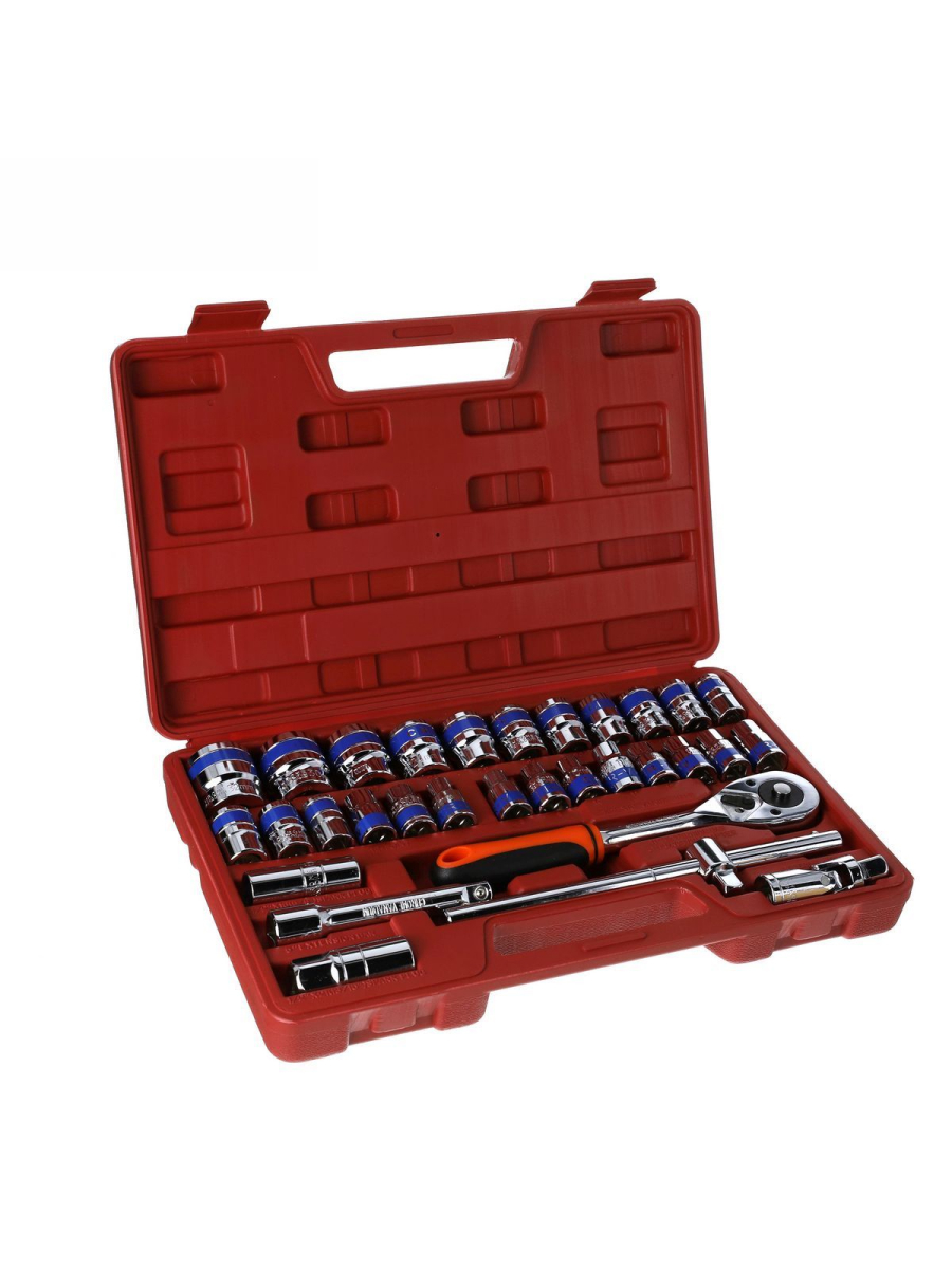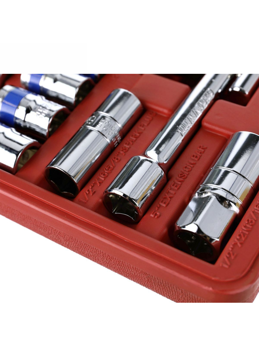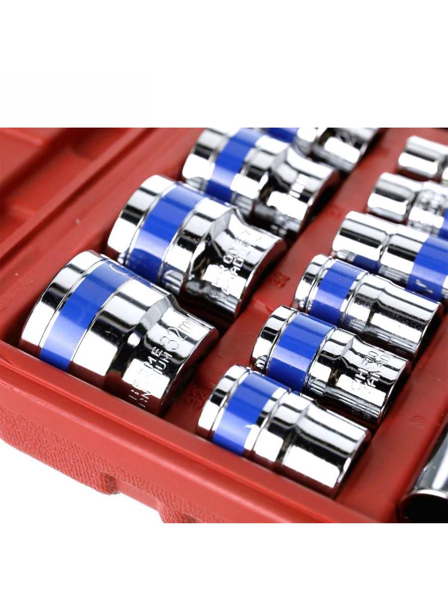 – 19 pcs-1/2” Dr.Sockets (6PT): 8, 9, 10, 11, 12, 13, 14, 15, 16, 17, 18, 19, 20, 21, 22, 24, 27, 30, 32 mm